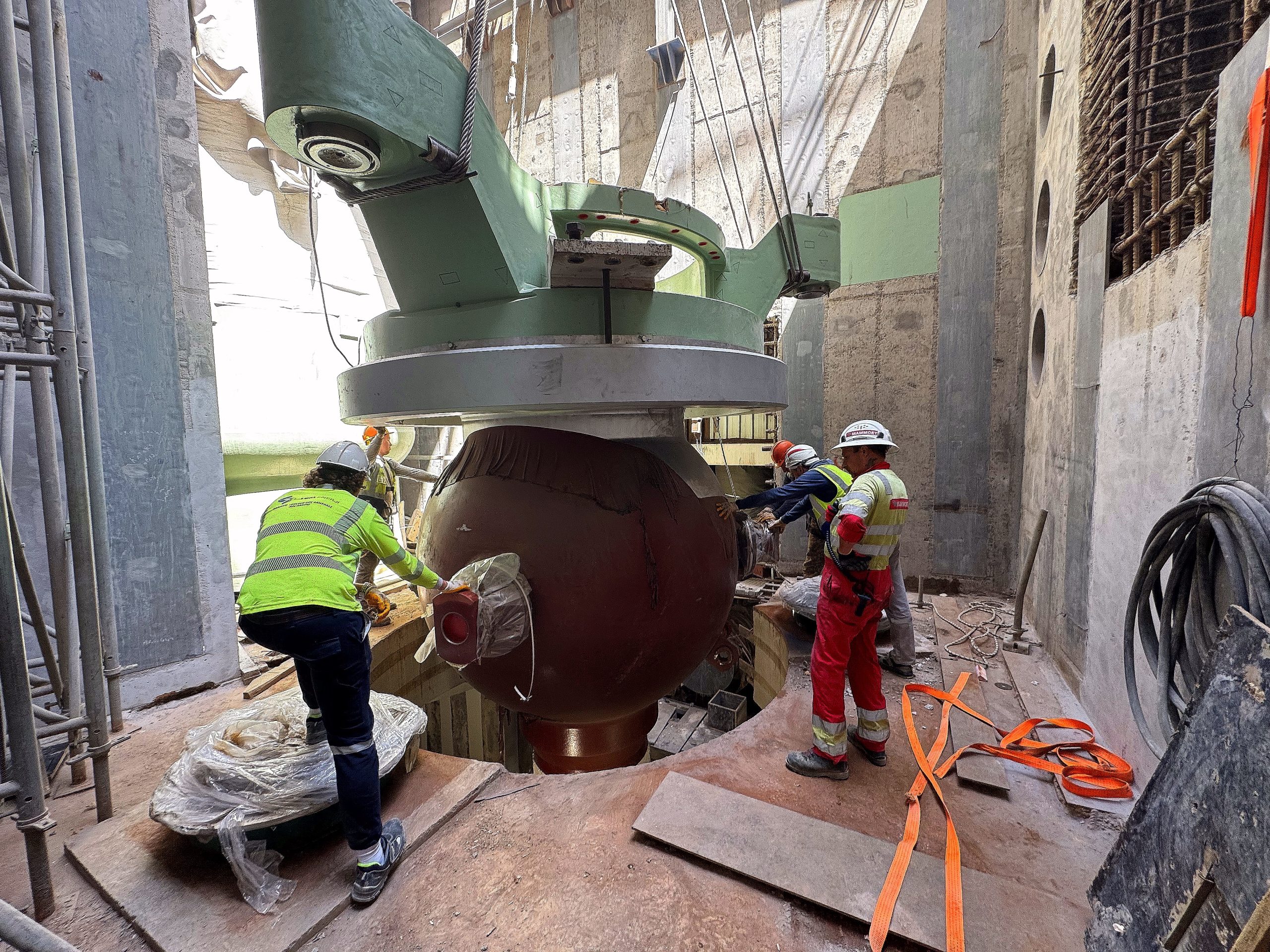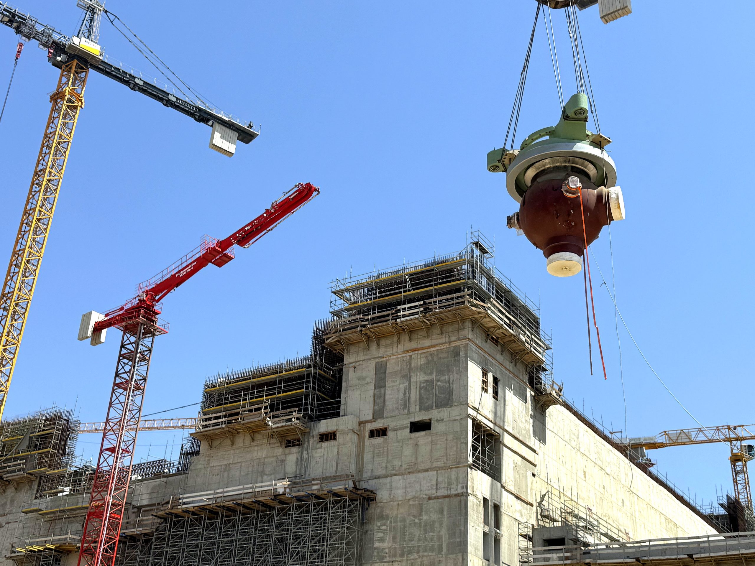 Pompanın küre şeklindeki 4 gövdesinden sonuncusu, paletli vinç kullanılarak tasarım konumuna yerleştirildi. Ekipman, reaktör binasının üstü açık kısmından kurulum alanına ulaştırılarak, ‘open top’ adı verilen yöntemle yerleştirildi. Uzmanlar, tasarım konumuna yerleştirilmeden önce güç ünitesi binasının yanındaki özel alana taşınan ekipmanı, süspansiyon elemanı olan alt ara parçaya ve biyolojik koruma halkasına bağladı.