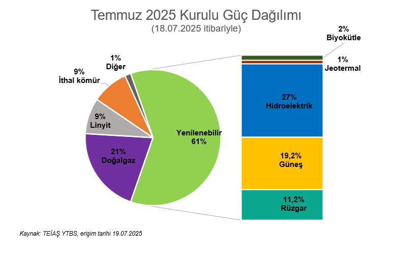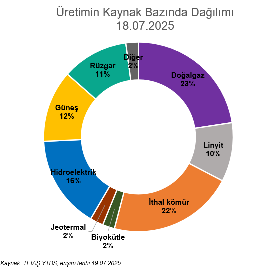 2025 yılı haziran ayında güneş santralleri, toplam üretimin %14,7’sini karşılayarak en fazla elektrik üreten yenilenebilir kaynak olmuştu. Temmuz ayının ilk 18 günlük verilerine göre ise güneş enerjisi santralleri linyit santrallerini de geride bırakarak yenilenebilir kaynaklar içindeki güçlü konumunu korudu.
