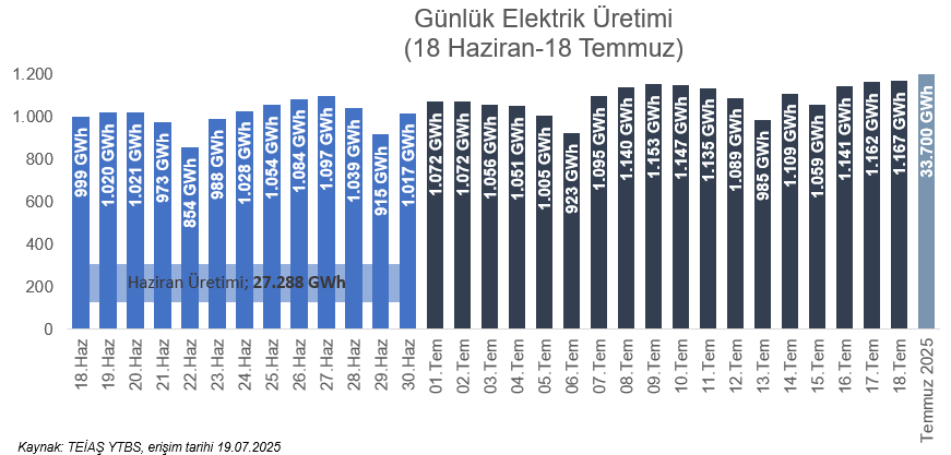 2025 yılı haziran ayında toplam elektrik üretimi 27.288 GWh olarak gerçekleşmiştir. Temmuz ayının ilk 18 gününde ise 19.562 GWh elektrik üretilmiştir. Haziran ayında günlük ortalama üretim 910 GWh iken, temmuz ayında bu rakam yaklaşık %19’luk artışla 1.087 GWh seviyelerine yükselmiştir.