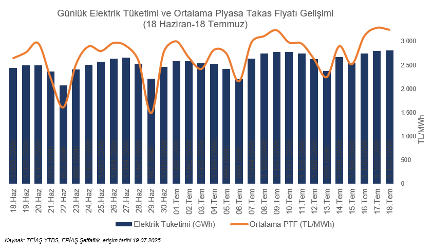 2025 yılı haziran ayında günlük ortalama 912 GWh ile toplam 27.364 GWh elektrik tüketimi gerçekleşmiştir. Temmuz ayında ise, mevsim normallerinin üzerindeki sıcaklıklar ve buna bağlı olarak artan soğutma ihtiyacı, elektrik talebinde belirgin bir artışa neden olmuştur. Günlük ortalama elektrik tüketimi, bir önceki aya göre %18 artarak 1.077 GWh seviyesine ulaşmıştır. Bu gelişmeler doğrultusunda, temmuz ayı toplam elektrik tüketiminin haziran ayına göre yaklaşık %23 artışla 33.609 GWh seviyesinde gerçekleşmesi beklenmektedir.
