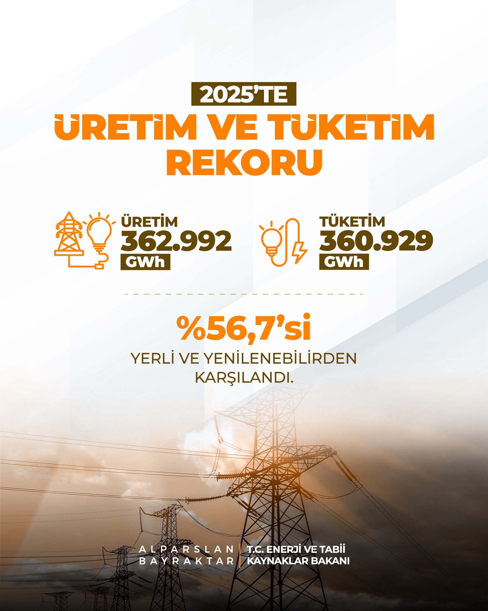 2025 yılında toplam elektrik tüketimi 360 bin 929 gigavatsaat ile tüm zamanların en yüksek seviyesine çıkarken, bu tüketime 362 bin 992 gigavatsaatlik rekor üretimle karşılık verildi.