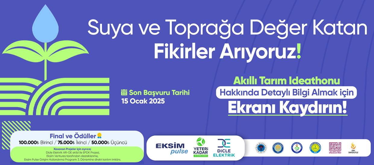 15 Ocak 2025 tarihine kadar başvuruları devam edecek ‘Eksim Pulse Akıllı Tarım Ideathonu’nda, eğitim ve mentorlük süreçleri 10-12 Şubat 2025 tarihleri arasında çevrimiçi olarak, finali ise 15 Şubat 2025 tarihinde Dicle Elektrik Genel Müdürlük binasında fiziki bir etkinlikle gerçekleşecek. Detaylı bilgi ve başvuru için yeterikadar.org ve eksimpulse.com adresleri ziyaret edilebilir.