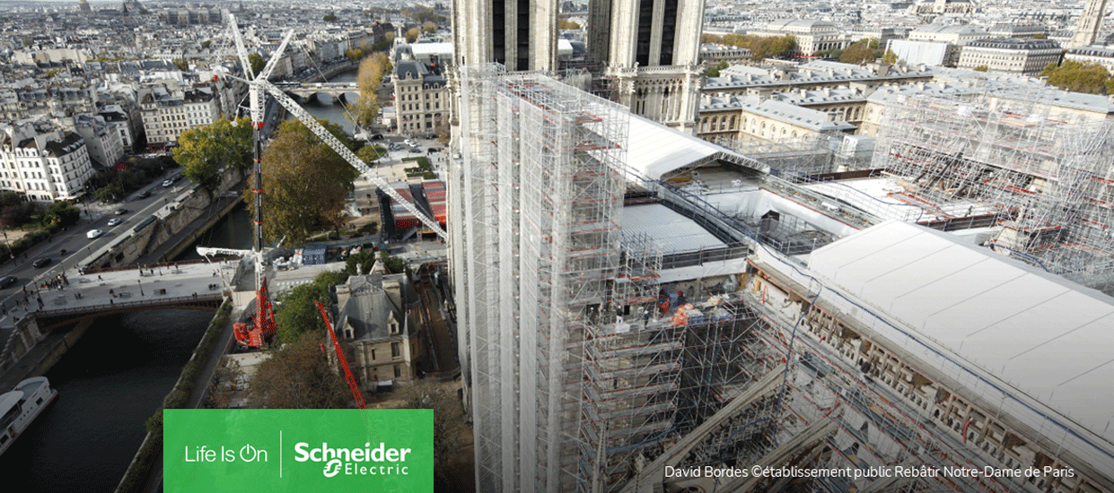 Enerji yönetimi ve otomasyonda dijital dönüşüm lideri Schneider Electric, bağışları aracılığıyla Paris’teki Notre Dame Katedrali’nin restorasyonuna katkıda bulunmaktan büyük onur duymaktadır. Bağışlanan çözümler sayesinde, katedralin elektrik altyapısı güvence altına alınmış ve izlenebilir hale getirilmiştir. Bina Yönetim Sistemi (BMS), anıtın enerji tüketimini yönetip optimize ederek, 21. yüzyılın yeniliklerini 1991 yılından bu yana UNESCO Dünya Mirası Listesi’nde yer alan, Orta çağ sanatının zirvesi olan katedrale entegre etmiştir.